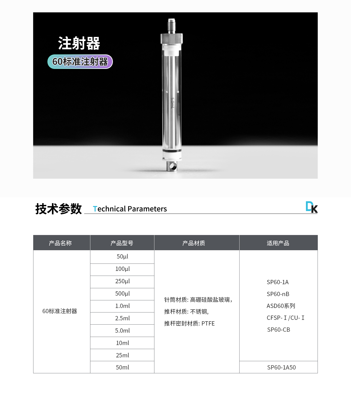 注射器型號:50μL、100μL、250μL、500μL、1.0mL、2.5mL、5.0mL、10mL、25mL